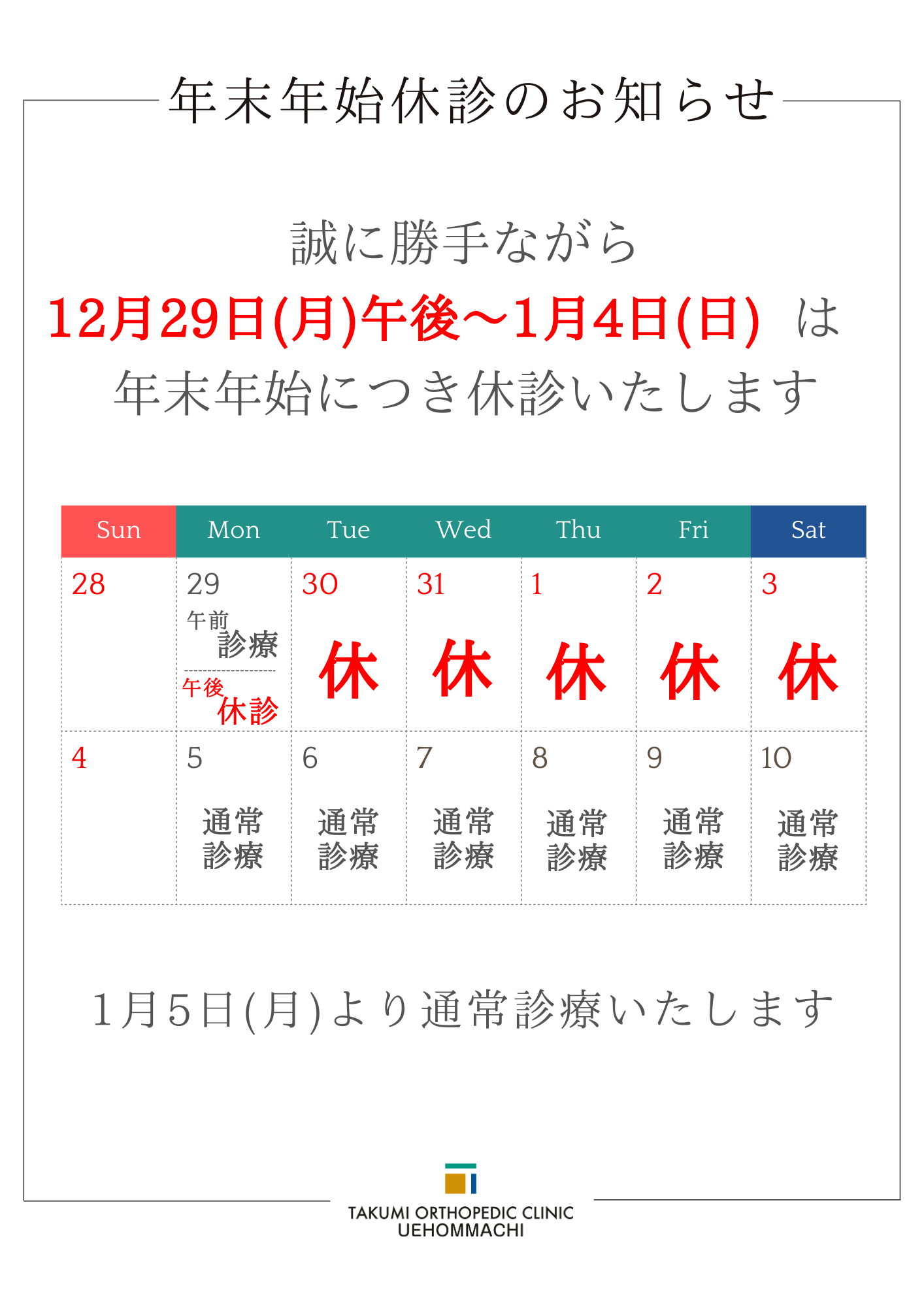 2025年12月29日(月)午後 ~ 2026年1月4日(日)は年末年始のため、休診とさせていただきます。